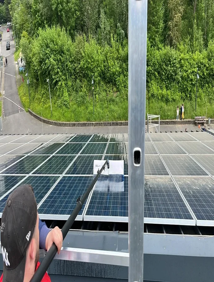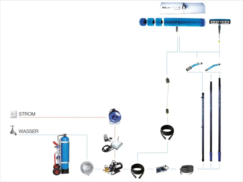 Wir arbeiten mit den Profi-Werkzeugen von Sola-Tecs. Je nach Anlage reinigen wir mit rotierenden Bürsten und entmineralisiertem Wasser.
